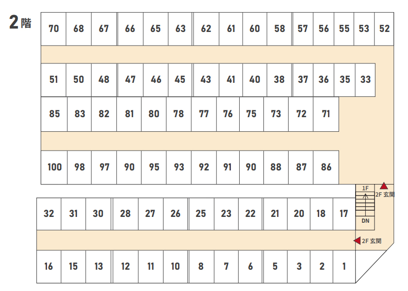 | No. | 広さ | 月額利用料 | 階 | 間口(m) | 奥行(m) | 高さ(m) | 備考 | 空き状況 |