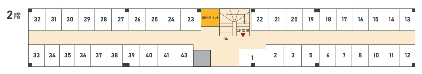 | No. | 広さ | 月額利用料 | 階 | 間口(m) | 奥行(m) | 高さ(m) | 備考 | 空き状況 |