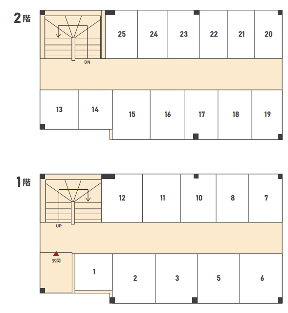 | No. | 広さ | 月額利用料 | 階 | 間口(m) | 奥行(m) | 高さ(m) | 備考 | 空き状況 |