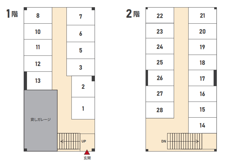 | No. | 広さ | 月額利用料 | 階 | 間口(m) | 奥行(m) | 高さ(m) | 備考 | 空き状況 |
