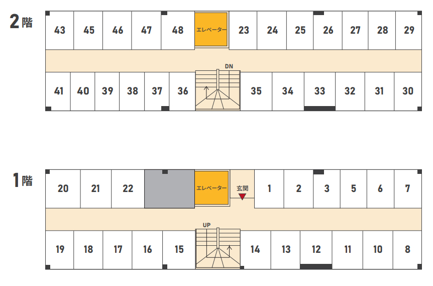 | No. | 広さ | 月額利用料 | 階 | 間口(m) | 奥行(m) | 高さ(m) | 備考 | 空き状況 |