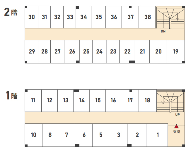 | No. | 広さ | 月額利用料 | 階 | 間口(m) | 奥行(m) | 高さ(m) | 備考 | 空き状況 |