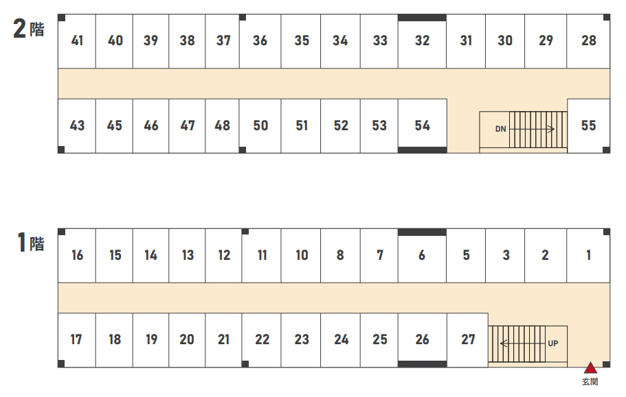 | No. | 広さ | 月額利用料 | 階 | 間口(m) | 奥行(m) | 高さ(m) | 備考 | 空き状況 |
